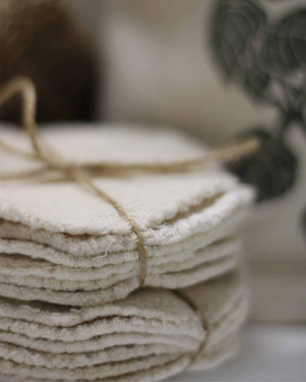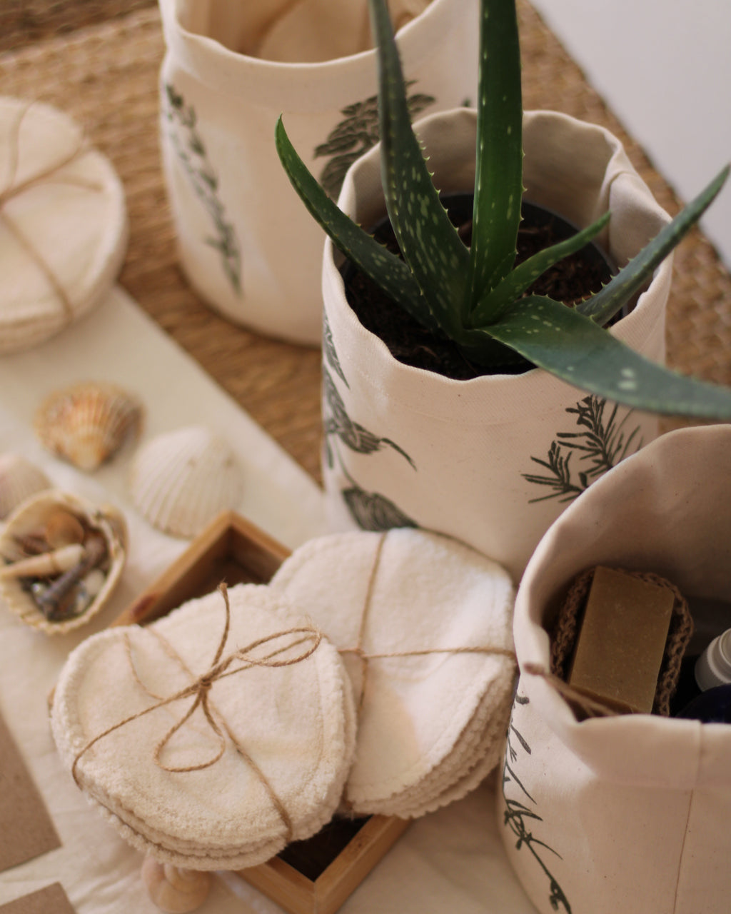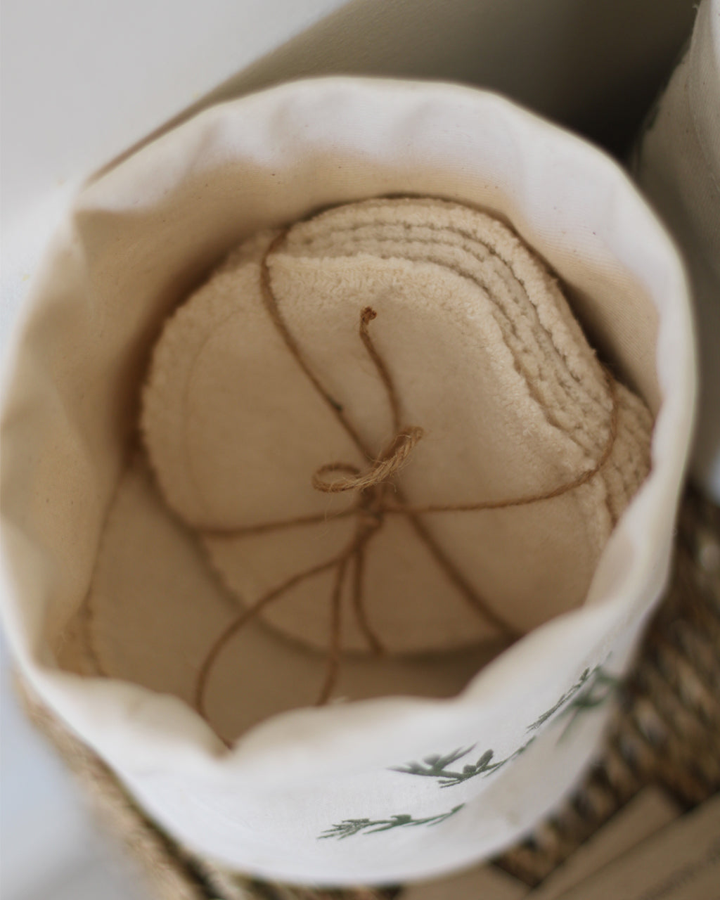 Le panier rond est accompagné de 6 disques de cotons lavables et réutilisables. Ces disques de cotons sont composés d'un côté doux pour démaquiller le visage et d'un côté en micro-éponge pour démaquiller les yeux. Ce lot a été spécifiquement conçu pour une utilisation quotidienne 100% éco-responsable.