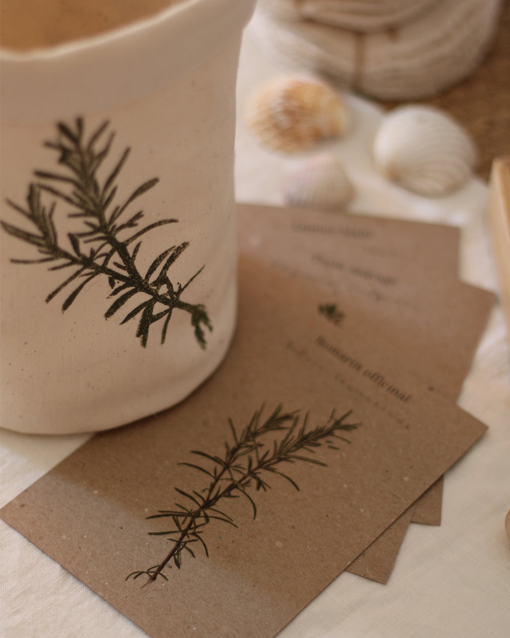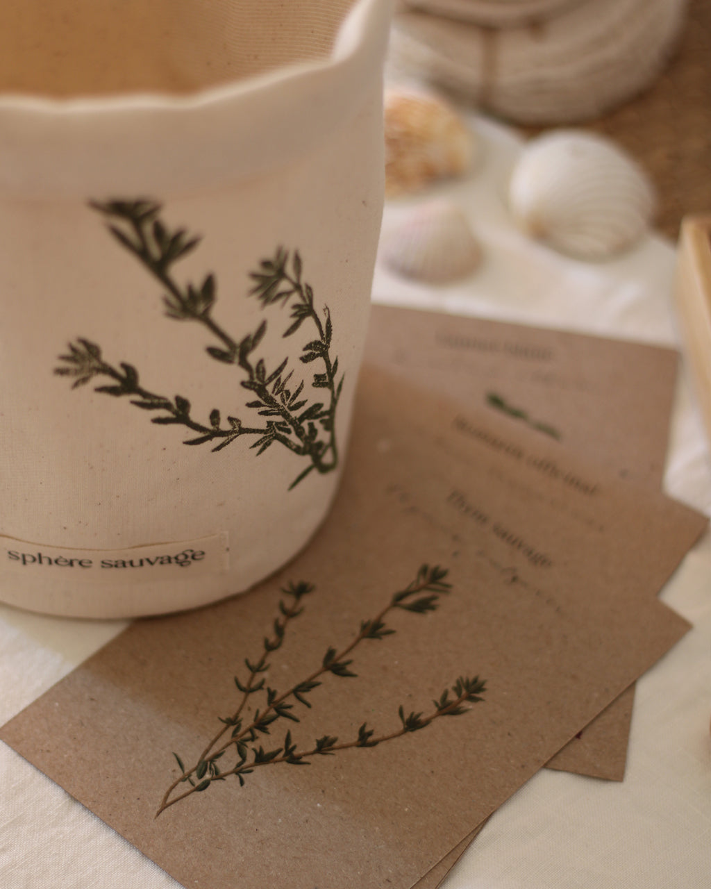 Chaque objet du quotidien est accompagné de 3 petites cartes A6, une pour chaque plante, avec l'illustration au recto et quelques informations au verso. Les illustrations ont été imaginées comme des cartes à collectionner.