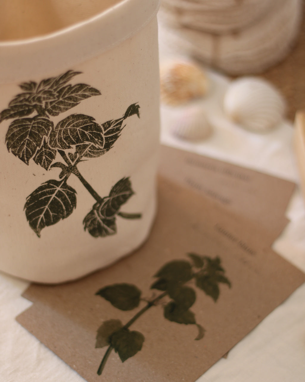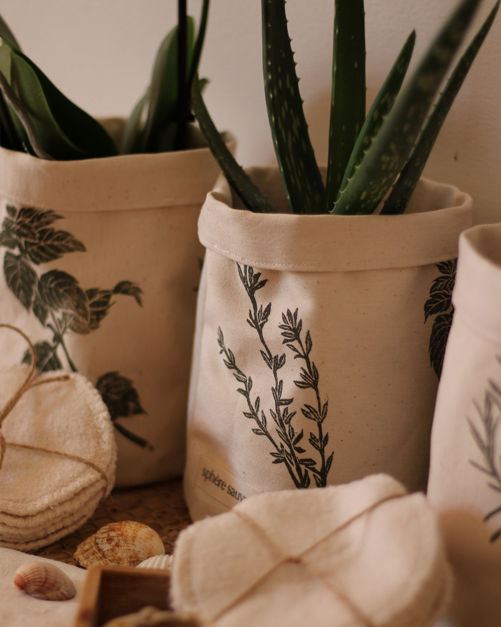 Le panier et les disques sont en coton 100% biologique certifié GOTS. L'encre des linogravures est certifiée Oeko-Tex.